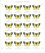 The stamp art was digitally created using images of preserved butterflies as a starting point. The result is a highly stylized, simplified image of a California Dogface (Zerene eurydice) rather than an exact reproduction.