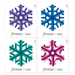 Antonio Alcalá and Leslie Badani designed the 2015 Snowflake stamps, featuring various types of snowflakes in different colors.