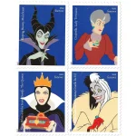 About the Disney Villains set: Includes 10 stamp designs portraying classic Disney villains. The reverse side of the pane showcases drawings of the 10 characters and their quotes. USPS states these stamps celebrate ‘the rich legacy of the Walt Disney Studios Ink & Paint Department.’
