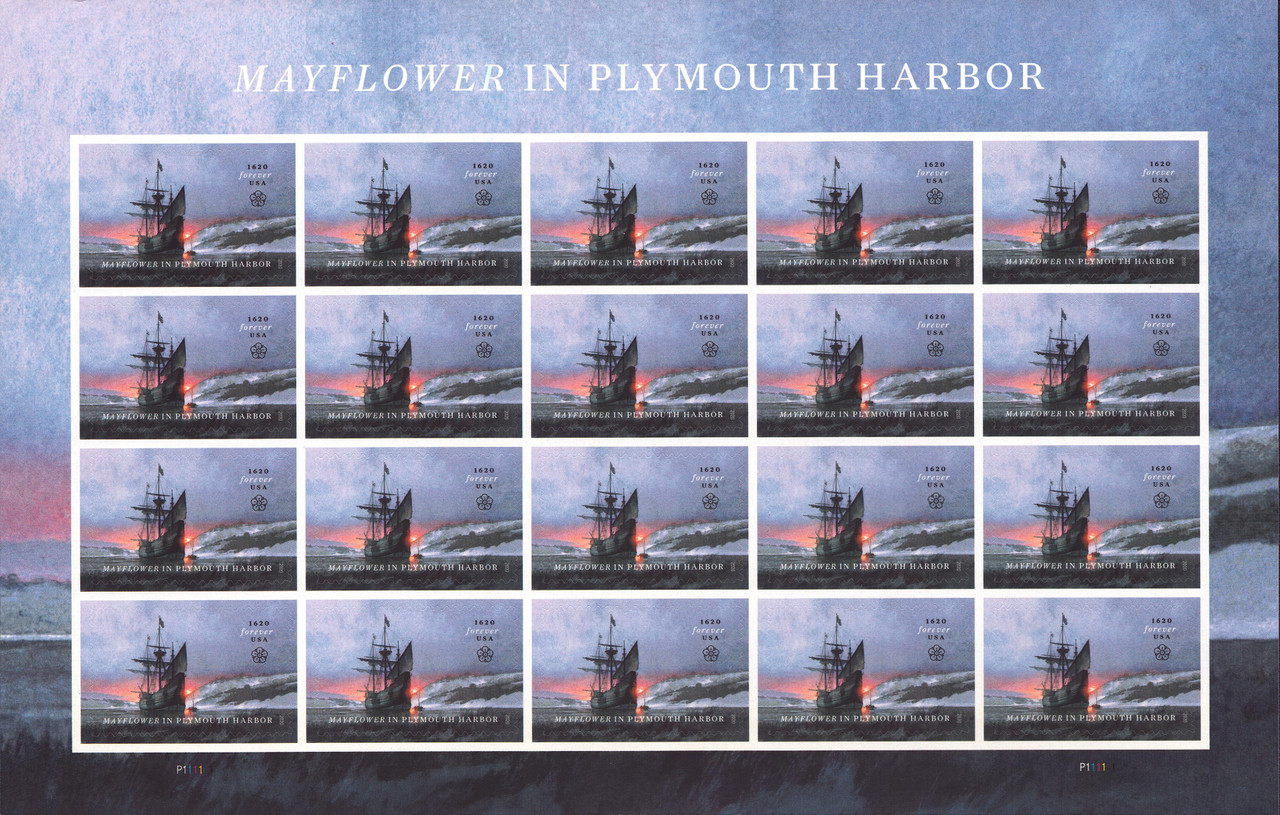 On September 17, 2020, in Plymouth, MA, the United States Postal Service® issued the Mayflower in Plymouth Harbor stamp (Forever® priced at the First-Class Mail® rate) in one design, in a pressure-sensitive adhesive pane of 20 stamps (Item 476700). The stamp went on sale nationwide on September 17, 2020, and was not to be sold or canceled before the first-day-of-issue. The Mayflower in Plymouth Harbor pane of 20 stamps was not to be split and the stamps were not to be sold individually.