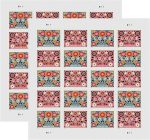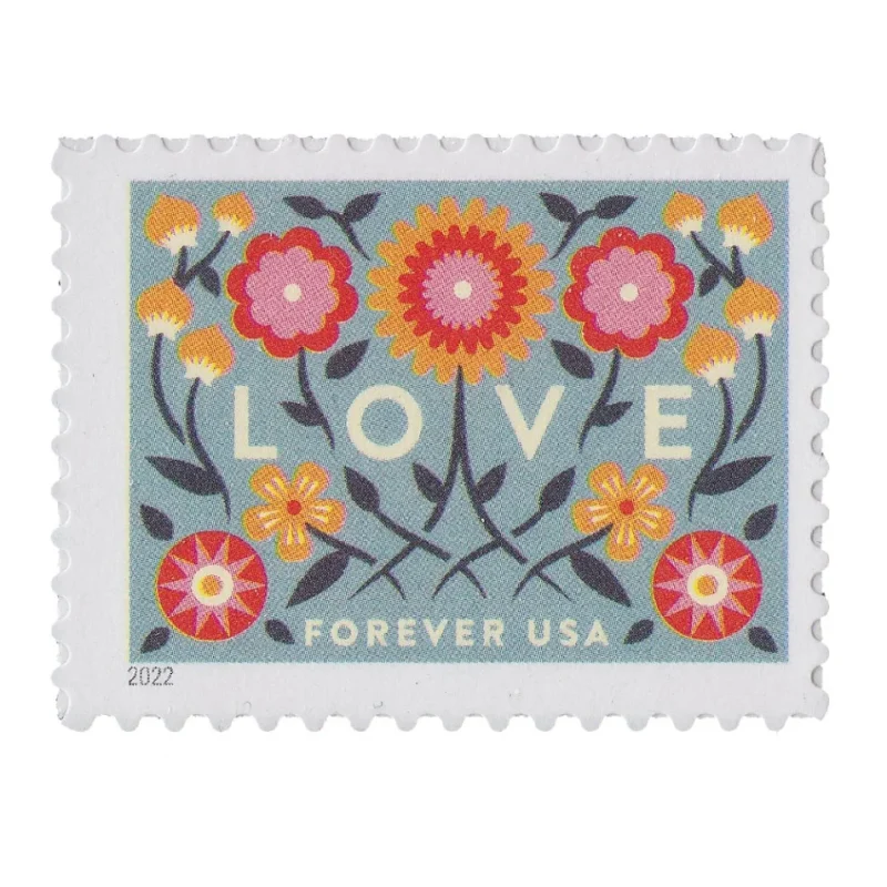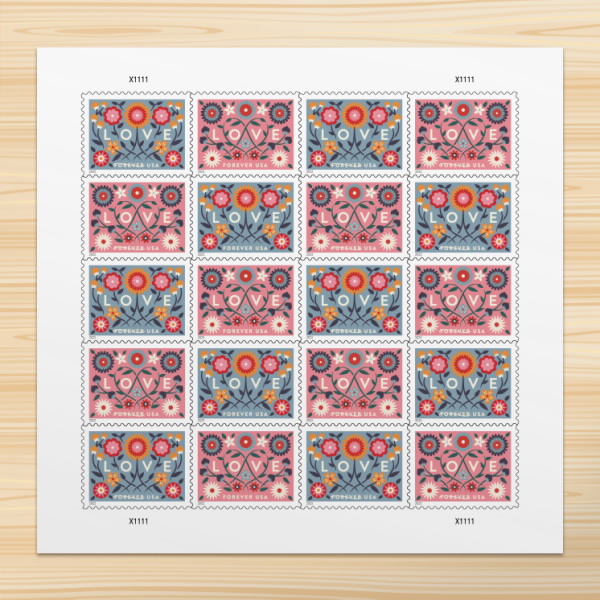 About the stamp design: Pictures graphic illustrations of flowers inspired by European folk art. Shows twisting vines, small flowers, and abstract heart shapes. The stamp has a powder blue background.
