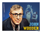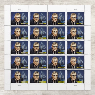 On February 24, 2024, in Los Angeles, CA, the United States Postal Service issued the John Wooden stamp (Forever® priced at the First-Class Mail® rate) in one design, in a pressure-sensitive adhesive (PSA) pane of 20 stamps (Item 484500).