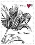 The tulip was chosen for the 2015 Weddings two-ounce stamp because it is a traditional declaration of devotion. This stamp was issued for use on wedding invitations and greeting cards that require extra postage. A coordinating Vintage Rose Forever stamp was also released for use on wedding RSVP cards and thank you notes.